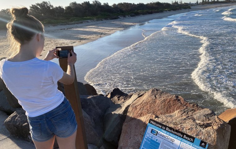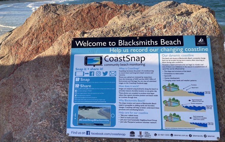 Enter the CoastalSnap project. At many beaches around Newcastle, you’ll find a special photo opportunity: steel cradles have been set up where you can rest your phone and snap a photo. The picture captures the beach from a fixed angle. Next to the cradle stands a sign with a hashtag — in this case, #CoastalSnapBlacksmiths. Upload it to Instagram or whichever social channel you like, and over time the changes become visible. Citizen science, crowdsourced.